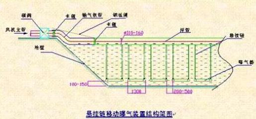 薄膜管式微孔曝氣器是一種應(yīng)用于水中供氧系統(tǒng)的新型充氧擴散裝置,他解決了現(xiàn)有曝氣器造價高,安裝維修不方便的問題。 本管式曝氣器與其連接的水面漂浮物和負重物的平衡作用力影響在水中處于懸浮狀態(tài),每組曝氣管作為一個單元,可以單獨通過提升鏈條提出水面檢修。布氣管是一種以化纖增強改良塑料為材料的軟性管狀曝氣器,進氣軟管和布氣管內(nèi)部的UPVC襯管連接,襯管和布氣管之間留有通氣間隙,氣體進入曝氣器的阻力明顯減少,可提高曝氣器的效率。